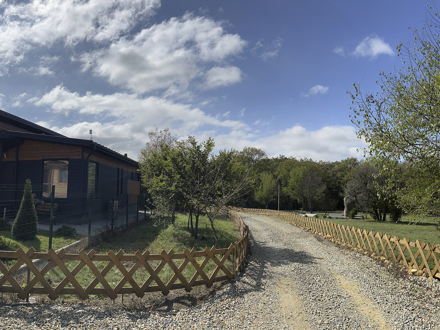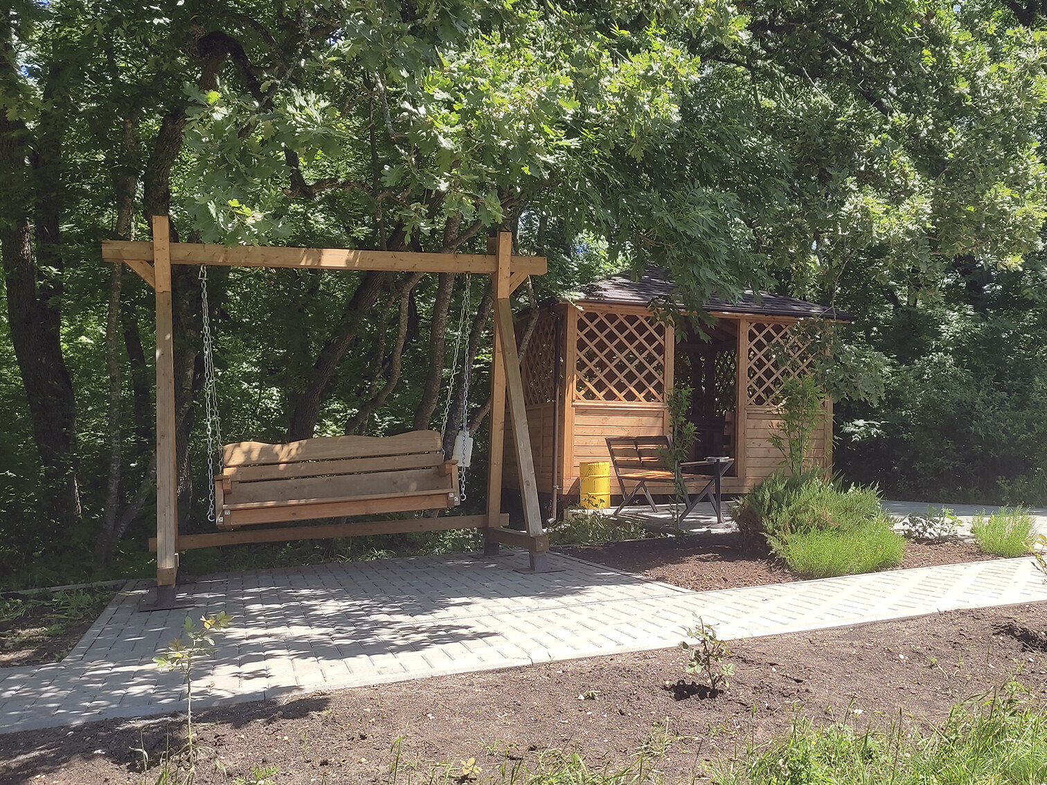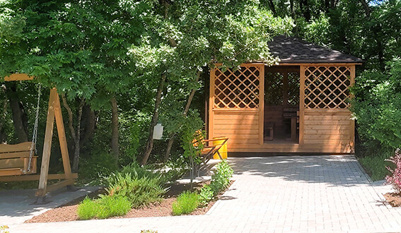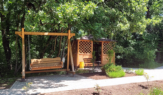 Уютные беседки расположены в живописном лесу, по соседству с «Парком Оленей». Территория полностью благоустроена: прогулочные дорожки, скамейки, мягкое освещение и деревянные качели создают атмосферу гармонии с природой.